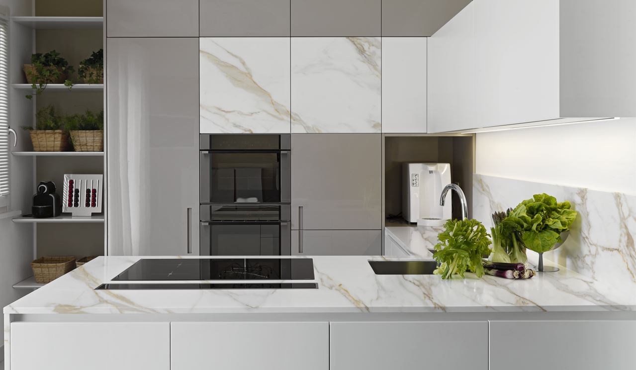 Dieses vom Glanz des Alten Roms inspirierte Modell besticht durch die Kombination der ockerfarbenen und grauen Maserungen auf weissem Grund, der dieser Interpretation des Carrara-Marmors eine besondere Nüchternheit und Eleganz verleiht.